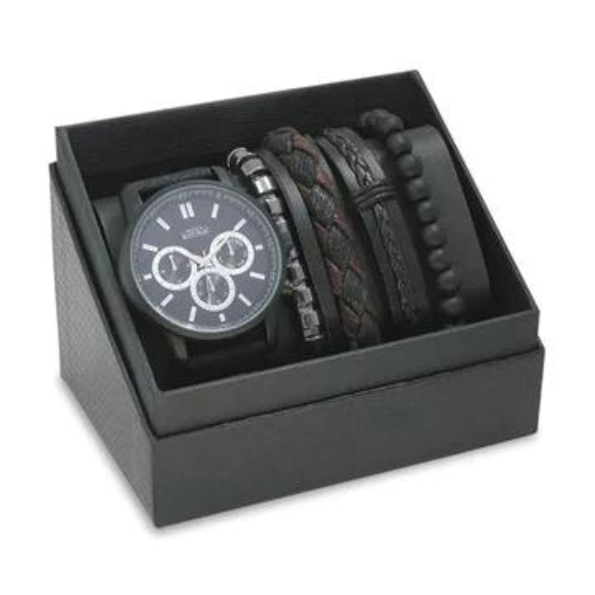 Men's Republic Black Chronograph Watch & 4 Bracelets Gift Set this elegant black Watch and Bracelet set is the perfect gift for the modern man.