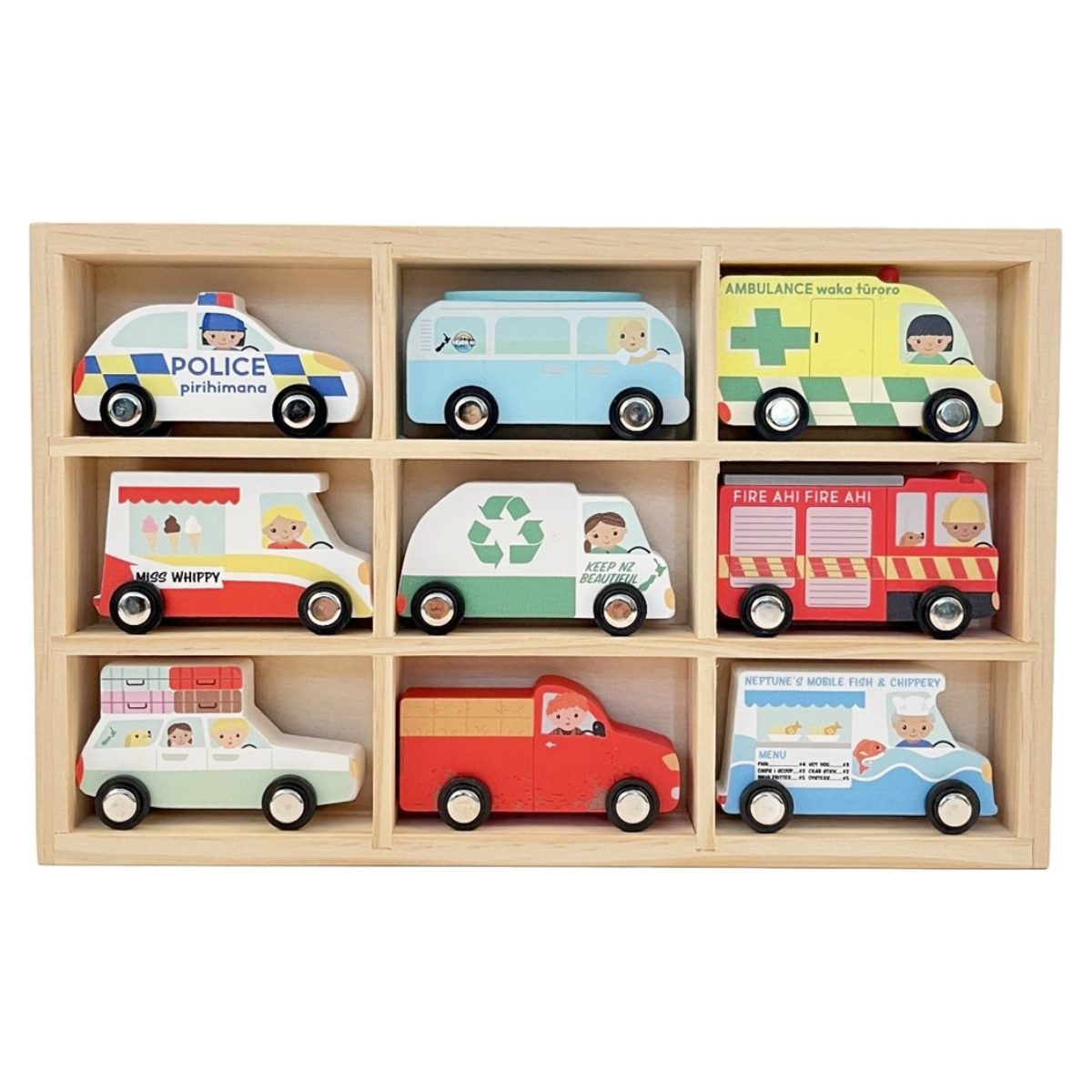 Moana Road Wooden Car Set hours of play with this wooden car set.