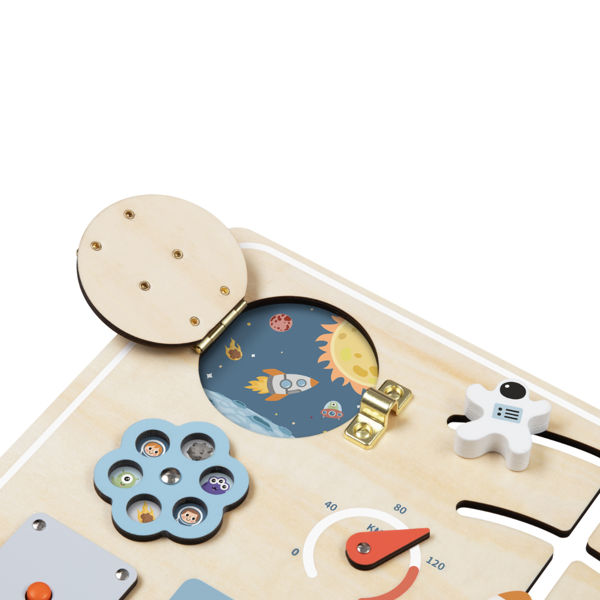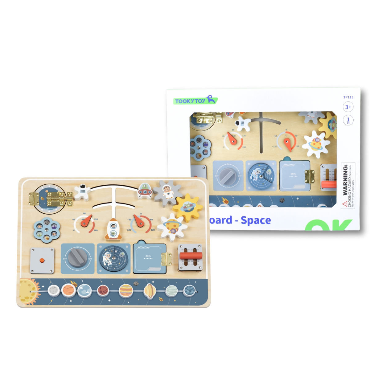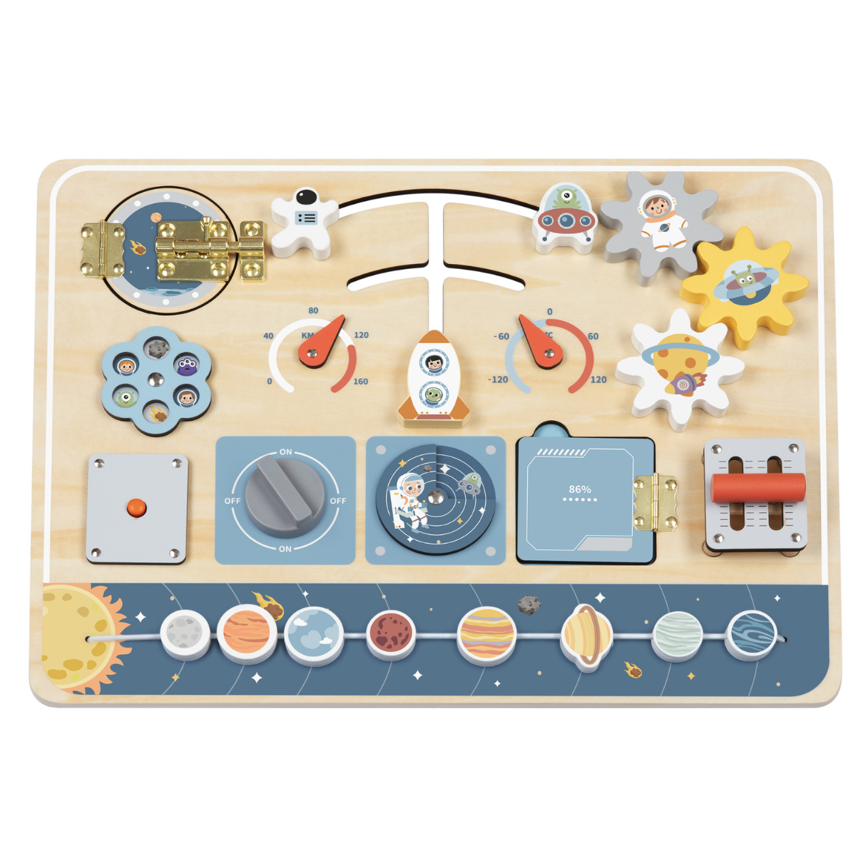 Embark on a journey through the universe of fun with the Tooky Toy Space Busy Board.