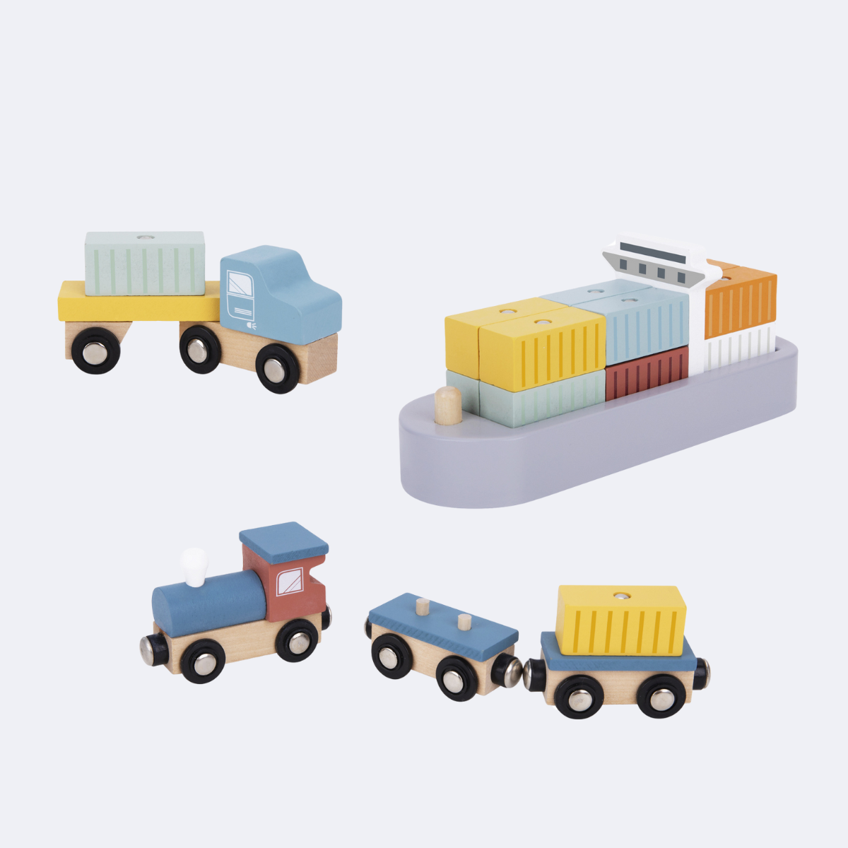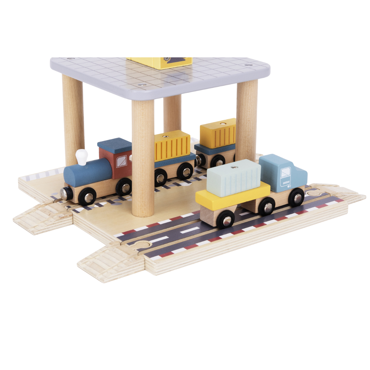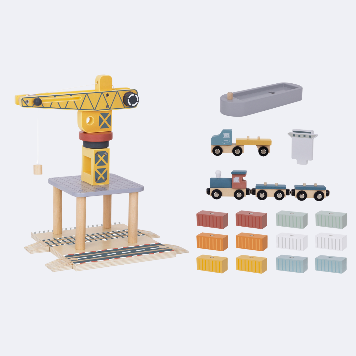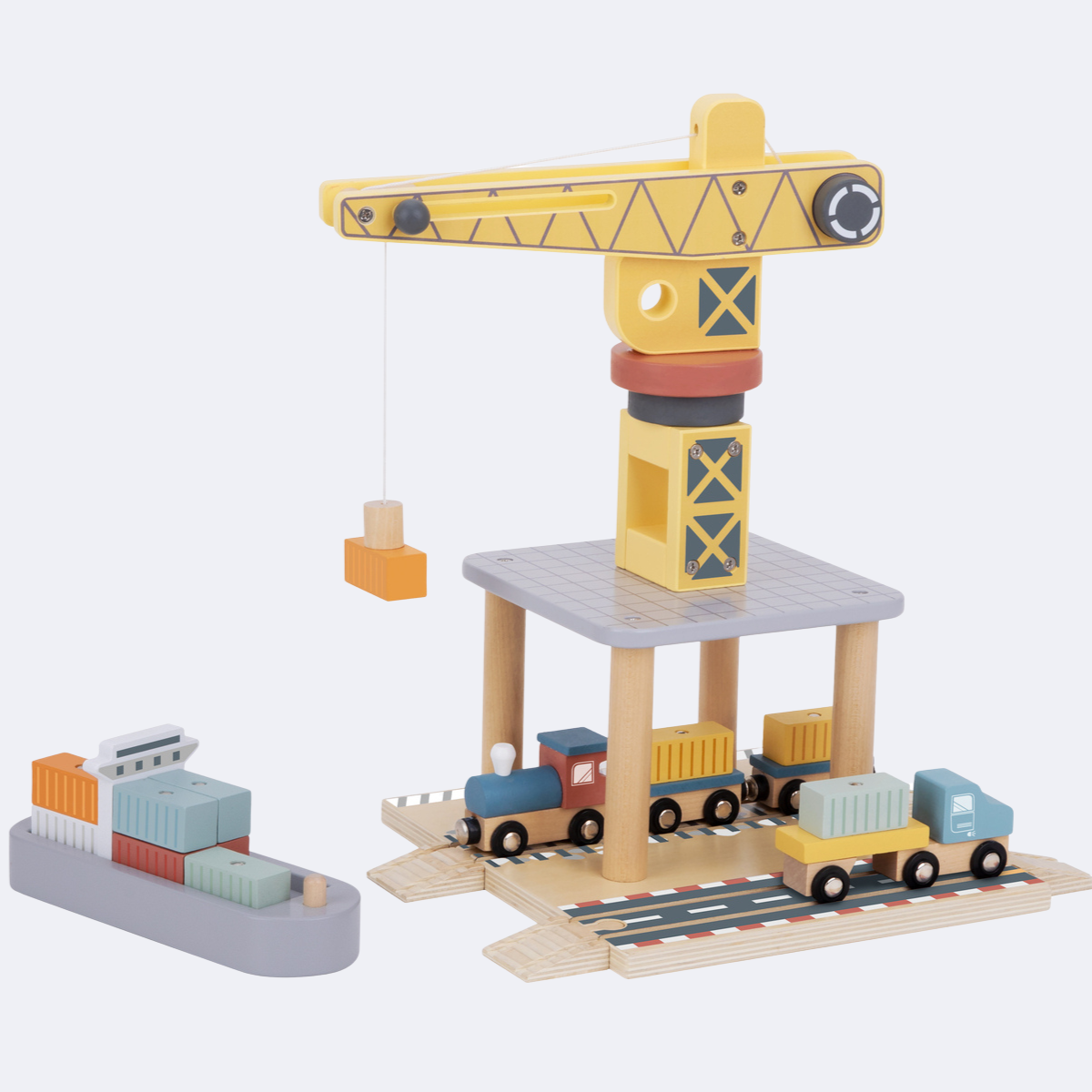This delightful set boasts a beautifully-crafted wooden crane as the central piece, perfect for loading and unloading cargo. Along with the crane, you'll find a train, truck, track, ship, and shipping containers, all working together to create an imaginative port scene.