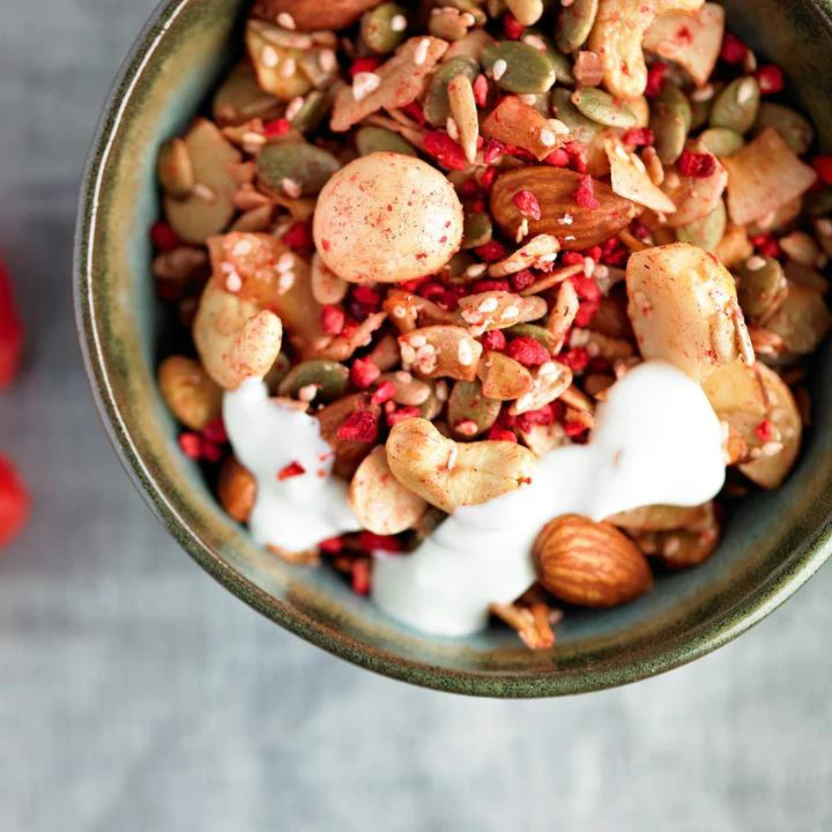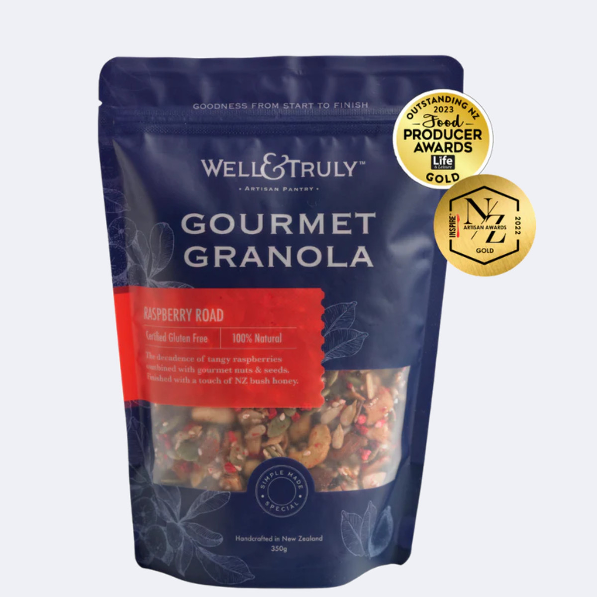 Well & Truly Raspberry Road Granola the decadence of tangy raspberries combined with New Zealand grown macadamias, gourmet nuts and seeds finished with a touch of New Zealand bush honey. A delightful, nutrient dense, small batch handcrafted granola.